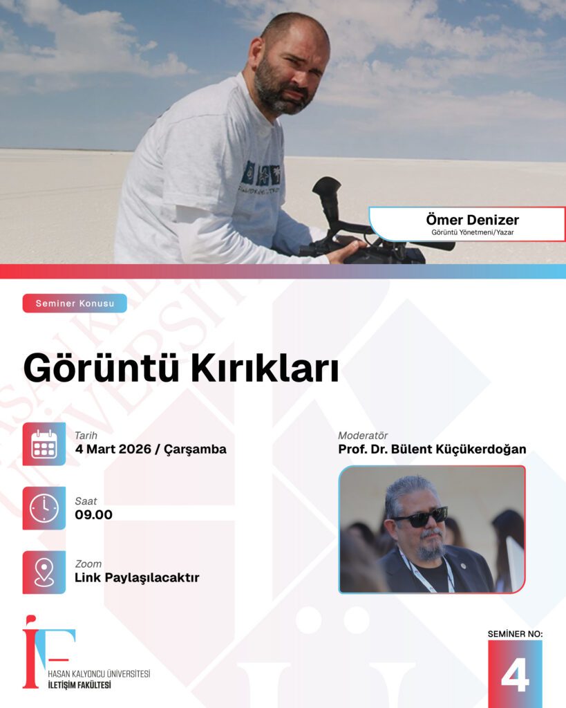 Görüntü Kırıkları Etkinlik Tarih & Saat: Mart 4, 2026 09:00 - 11:00 Yer: İletişim Fakültesi Türü Seminer Konu Görüntü Kırıkları Konusmaci(lar) Ömer Denizer Düzenleyen İletişim Fakültesi Organizasyon Dil Türkçe Açiklama